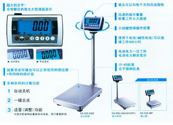 DS-55不銹鋼數(shù)字臺秤、 防水型設(shè)計、IP-65標(biāo)準(zhǔn)全不銹鋼機(jī)身 高強(qiáng)度機(jī)身、堅固耐用;特別針對有水作業(yè)區(qū):防水、防銹、耐腐蝕 灰塵封閉 快速且超大的數(shù)字顯示,非常醒目的背光大型液晶顯示 表頭可以向各個方向自由旋轉(zhuǎn) 大按鍵方便操作 電池電量顯示一目了然 自動關(guān)機(jī)功能 一鍵去皮功能 適量調(diào)整功能
